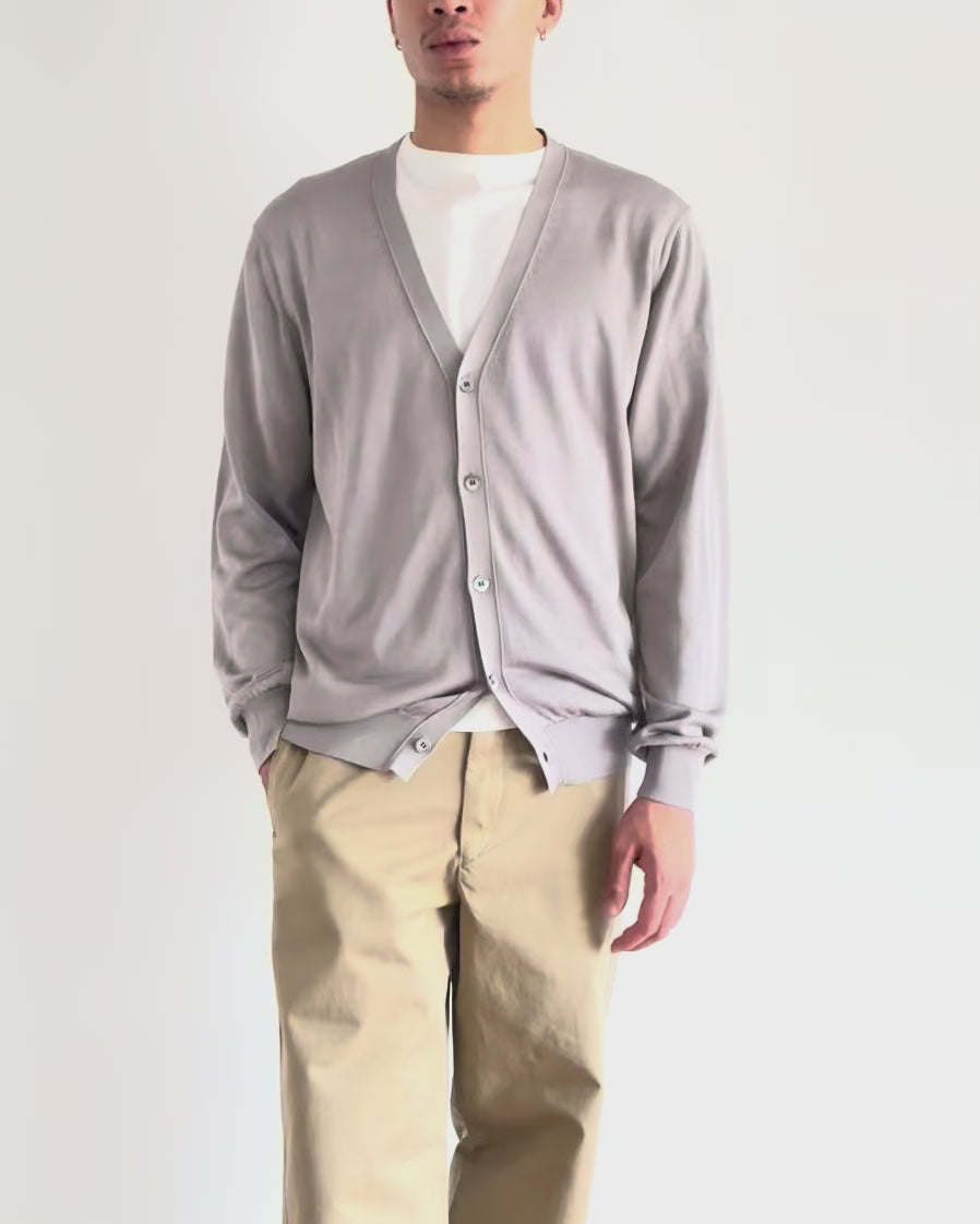 最高級のシルクを用い、12ゲージ天竺編みをフルファッション*で丁寧に編み立てた Vネックカーディガン。 上品な光沢と程よい厚みがあり、シルクならではの極上な肌ざわり。。アンサンブルでの着用を考慮したゆとりのあるサイジング。シルクシリーズ初の12Gゲージユニセックスモデル。 *身頃や袖などをパーツごとに編み、リンキングと呼ばれるかがり合わせをして製品が完成すること。