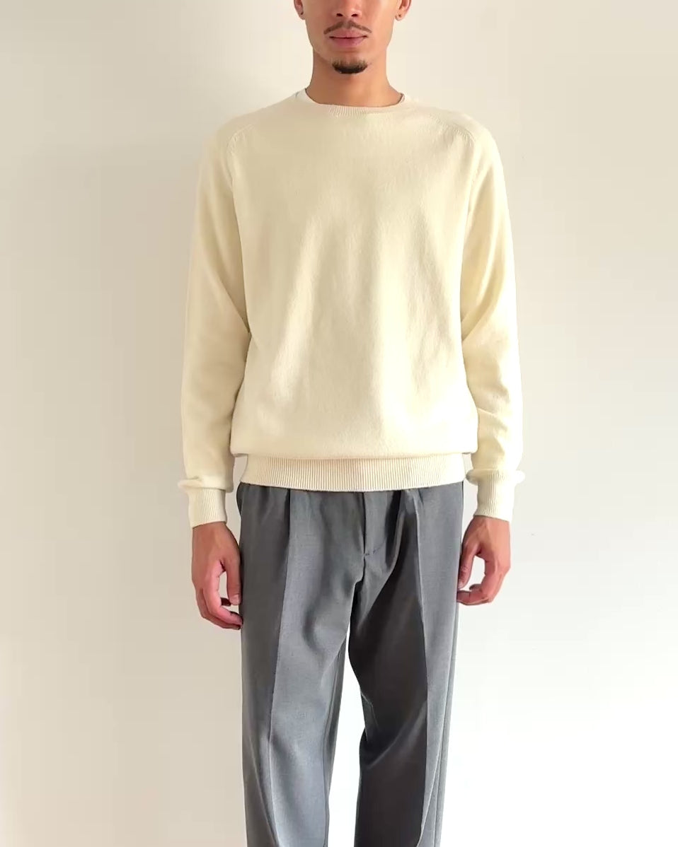 イタリアの紡績に別注した最高級のエクストラファインメリノウールと、カシミアをブレンドしたのスローンオリジナル糸を用い、10ゲージ 天竺をフルファッション*で丁寧に編み立てたクルーネック。ミドルゲージの程よい厚みで、カシミア混ならではの暖かさと柔らかな風合い。