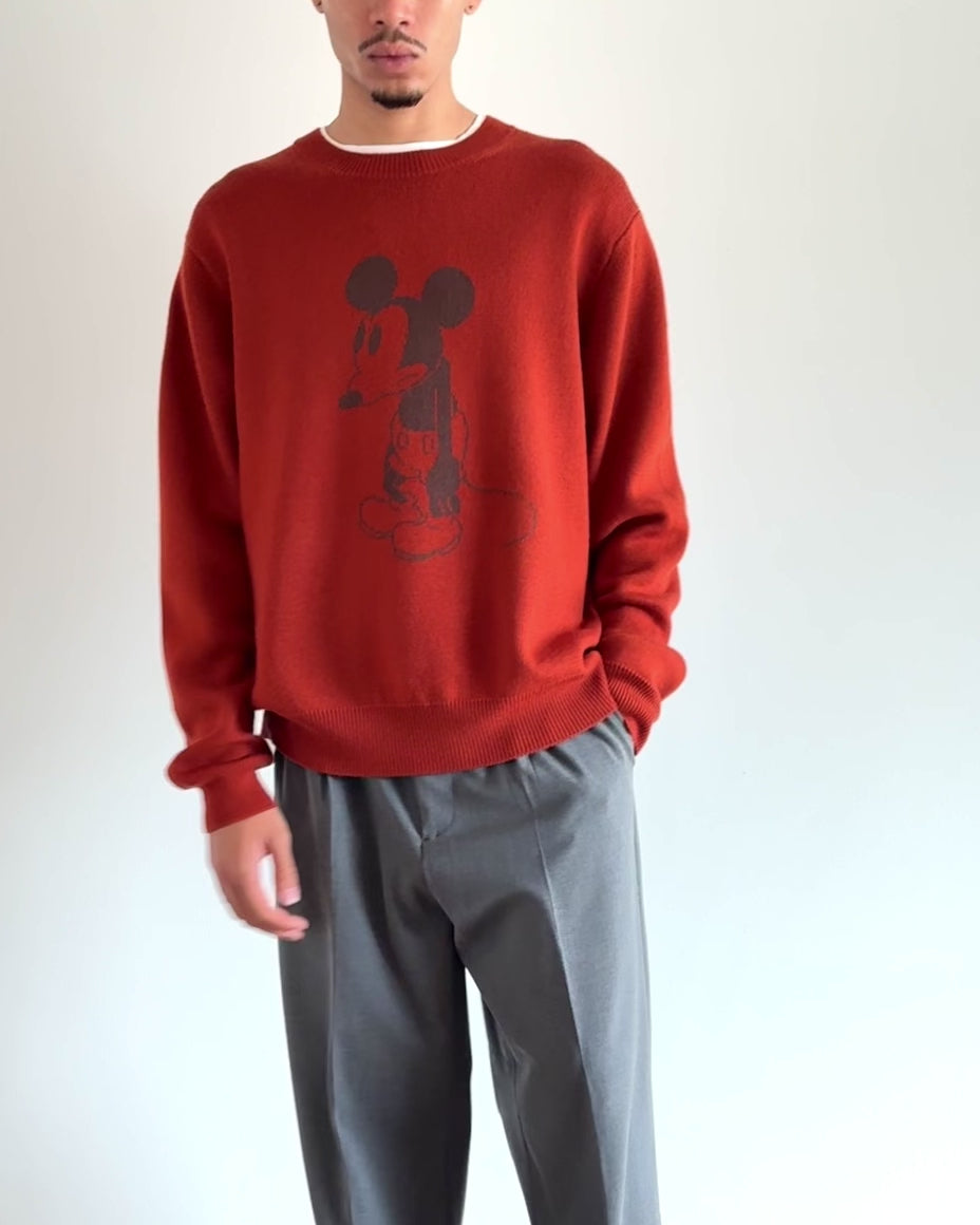 厳選された繊維長の長い羊毛を使用した、最高級のエクストラファインメリノウールを用い、10ゲージ ダブルジャカード編みをフルファッション*で丁寧に編み立てたクルーネック。「蒸気船ウィリー」より、山猫キャプテン・ピートに叱られているシーンを表現したMICKEY MOUSEのモチーフが哀愁漂う。後ろ身頃にSLOANEロゴ入り。